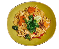 Gebratene Reisbandnudeln mit Gemüse, Chilisoße, Erdnüsse, Röstzwiebeln, Koriander und Hühnerfleisch (4,a,d,e)
